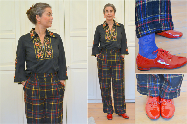 ... und deshalb habe ich diese neuerworbenen roten Lackschuhe auch nur auf den Fotos an (draußen werden sie durch fellgefütterte schwarze Wildlederstiefel eingetauscht). Bei den grade laufenden Schlussverkäufen, in die ich mich nur seltends hineinstürze, habe ich dieses Paar Echtlederschnürschuhe für 25,-€ gekauft. Ich vermute, dass sich wiedermal niemand an die Dinger rangetraut und das enorme Potenzial erkannt hat. Da ich aber ganz Ähnliche schon in einem froschgrün besitze, weiß ich, dass diese Schuhform in Knallfarben universell einsetzbar ist. Sie passen sich jedem Stil an, ohne dabei x-beliebig zu sein. Diesmal wurden sie mit einer derben Wollkarohose (Freundinschenkung) und einer 70er bestickten Bluse kombiniert. Verbindende Elemente sind: Schwarzer Untergrund, der mit leuchtenden klaren Farben ergänzt wurde. Unter der Bluse nimmt das Unterhemd die Farbe der Strumpfhose und der blauen Streifen in der Hose wieder auf. Die Lachstöne in der Stickerei tauchen dann bei den selbstgebastelten Ohrringen wieder auf. Solche und ähnliche Ohrringe habe ich in allen möglichen Farben, so dass sich immer was Passendes findet. Klingt kompliziert, ist es aber im Alltag bei einer gewissen Übung gar nicht. Die Auswahl meiner Kleidung läuft in Sekundenschnelle ab - ich muss mir nur vorher im Klaren sein, wie es mir geht.